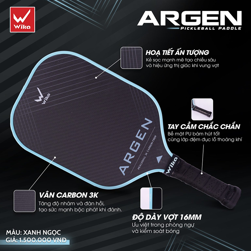 Wika Argen không chỉ ấn tượng về hiệu năng mà còn nổi bật về ngoại hình. Các đường sọc chéo phối trên nền đen nhám tạo chiều sâu thị giác, mang lại cảm hứng mạnh mẽ và sự tập trung cho người chơi trong từng cú vung vợt.